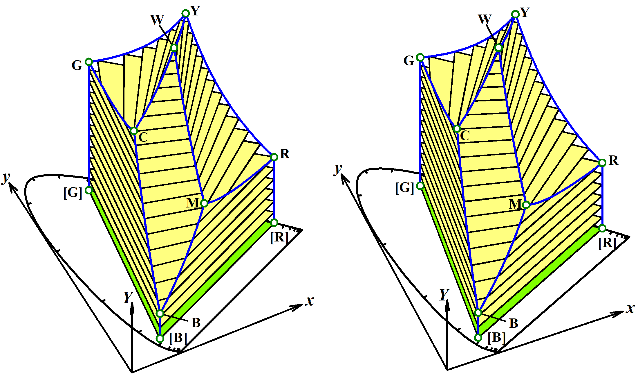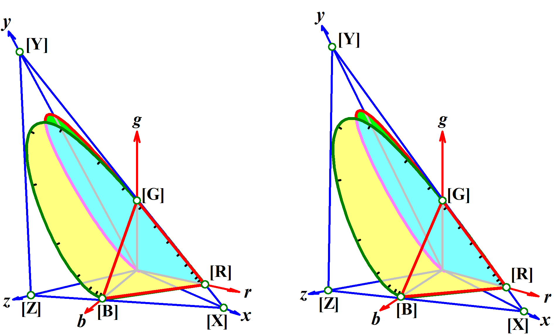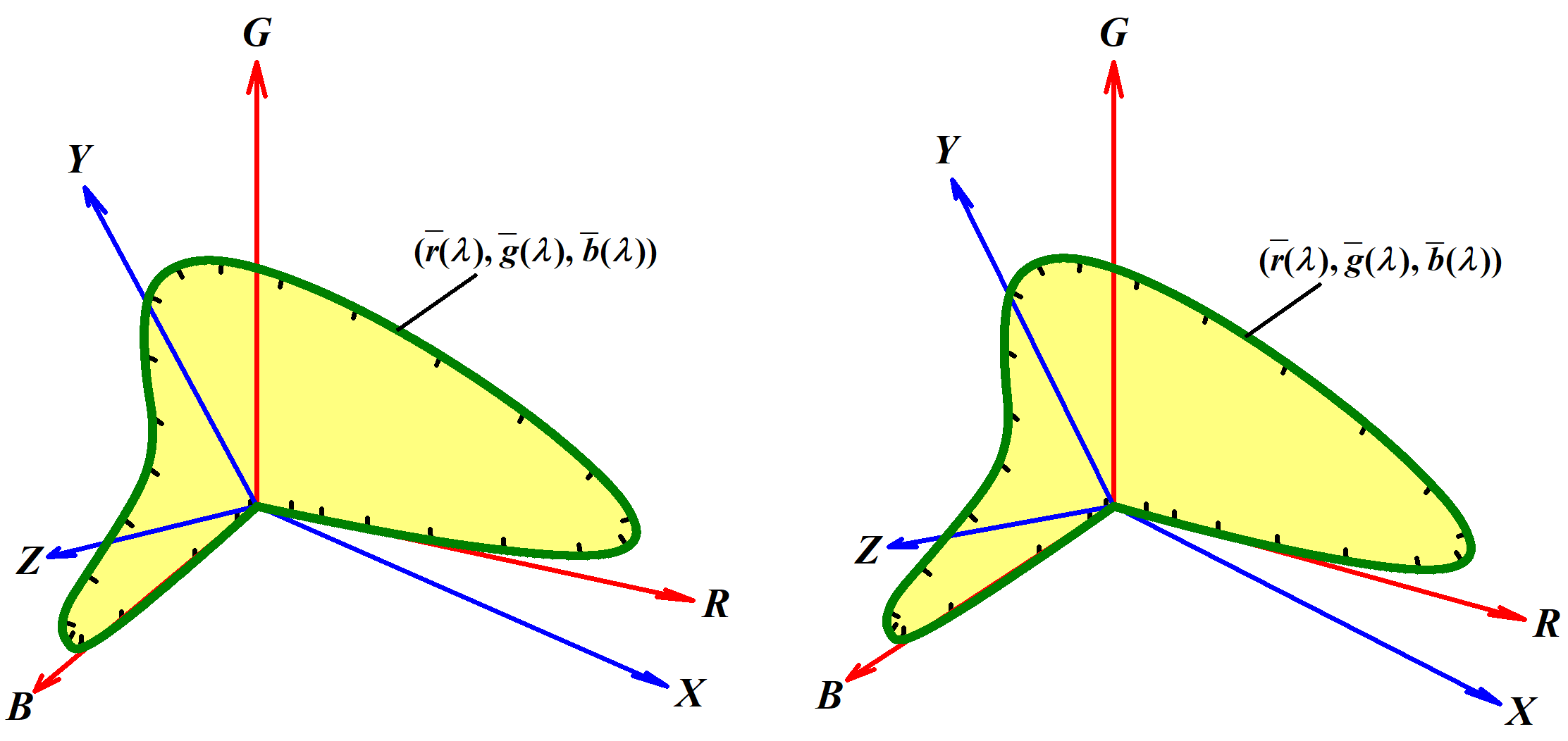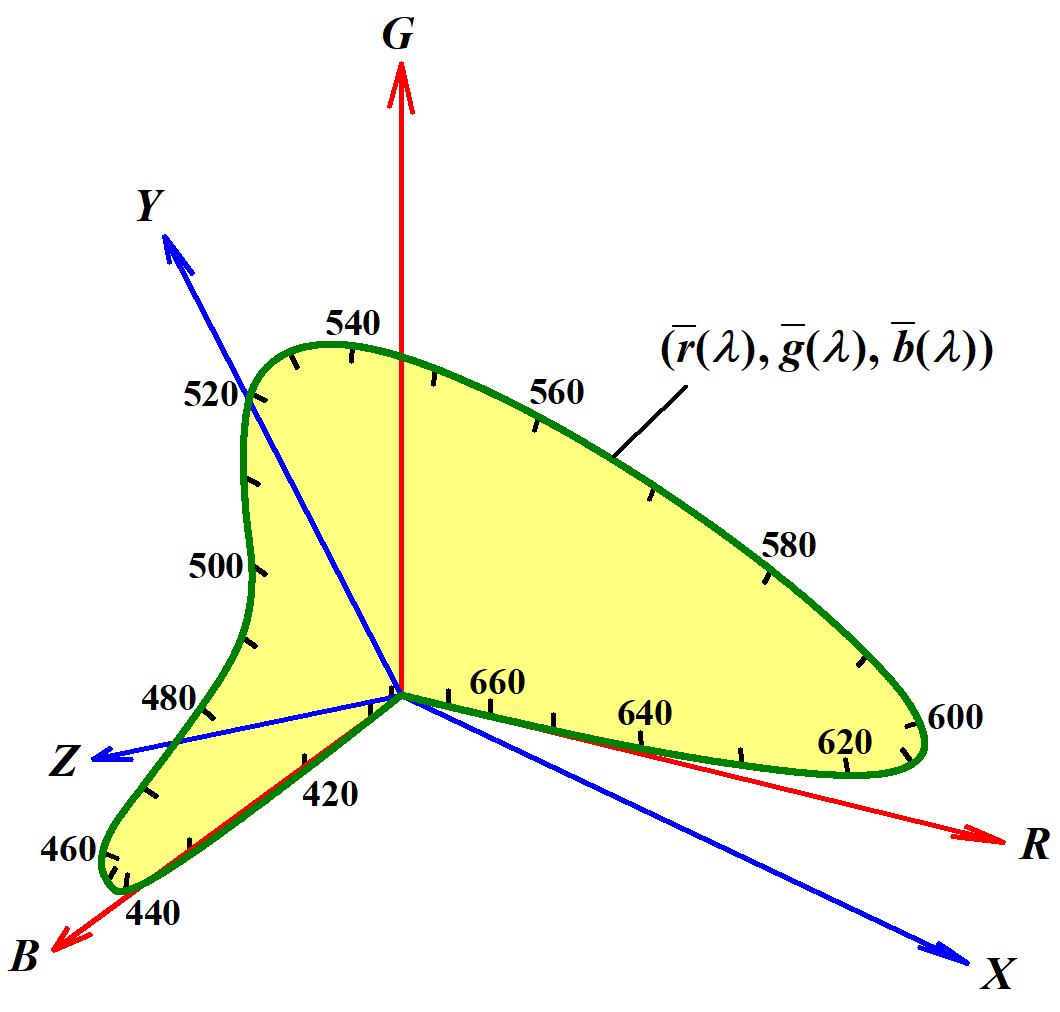 図6 RGB色空間上に表した(r(λ), g(λ), b(λ))