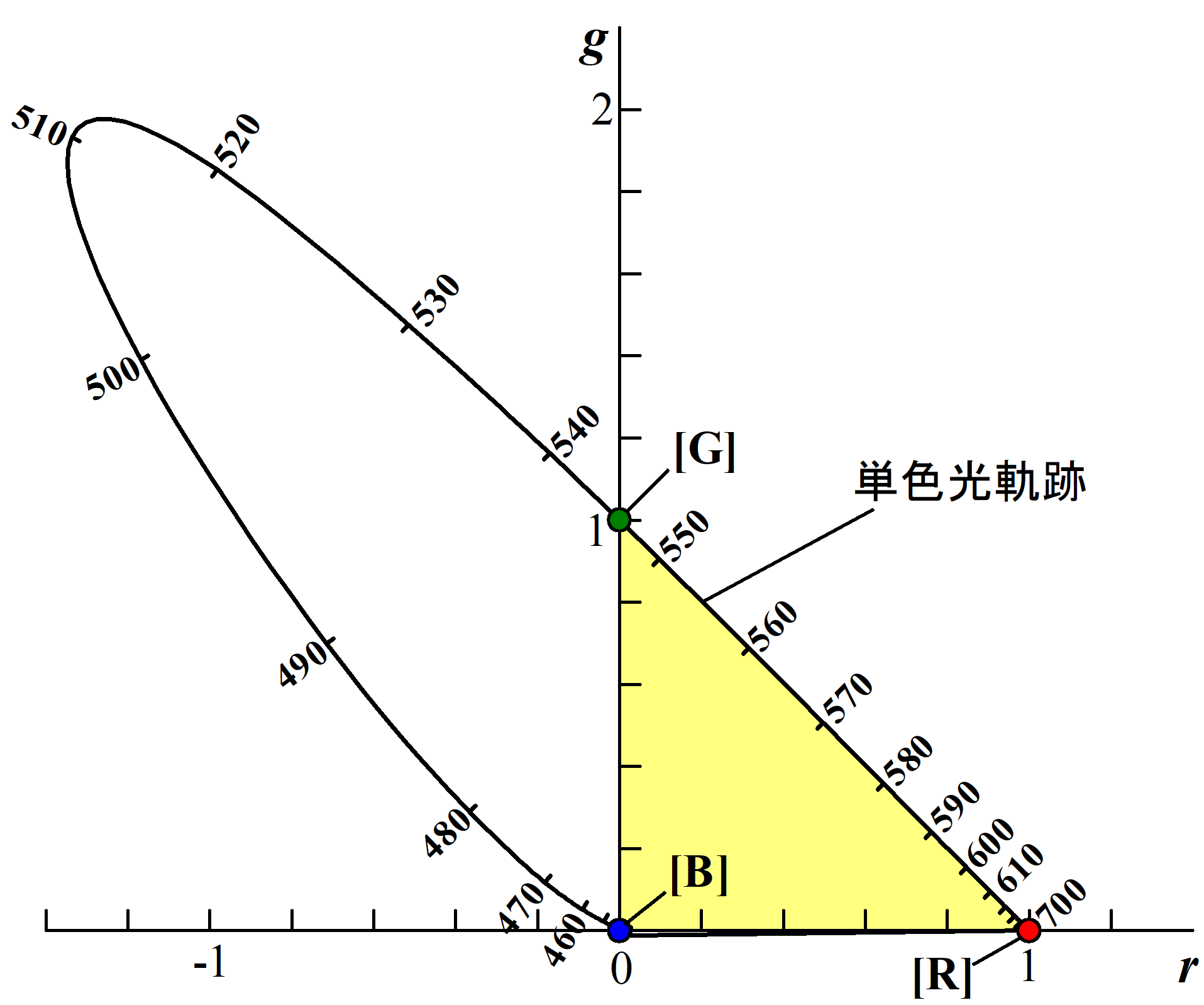 図8 RGB表色系のrg色度図空間に表した単色光の座標