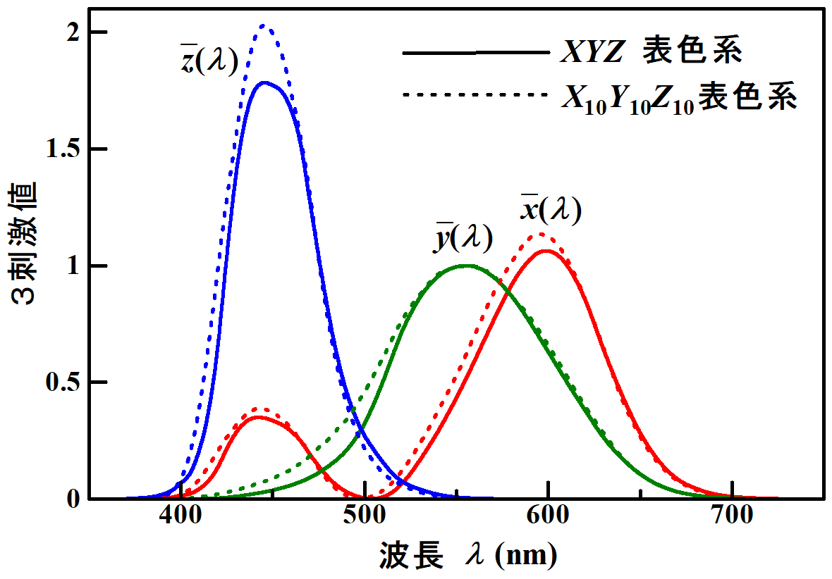 図1 錐体と棹体の分光感度および明所視の分光視感効率V(λ)と暗所視の分光視感効率V’(λ)