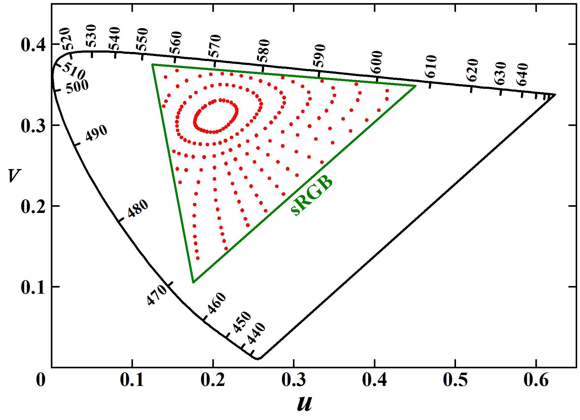 図13 uv色度図におけるsRGBの色域とマンセル表色系の色票(V=4)