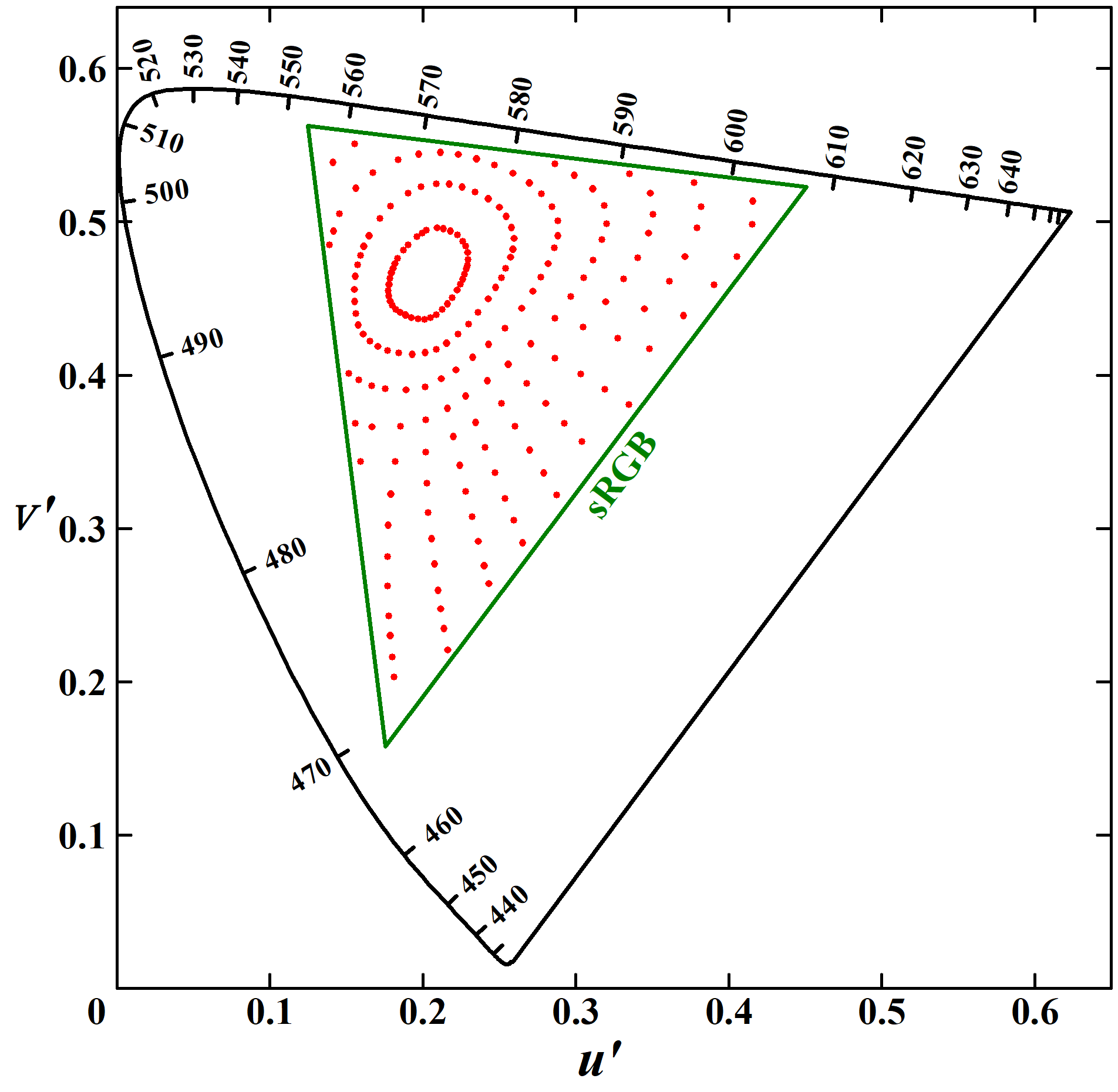 図14 u’v’色度図におけるsRGBの色域とマンセル表色系の色票(V=4)