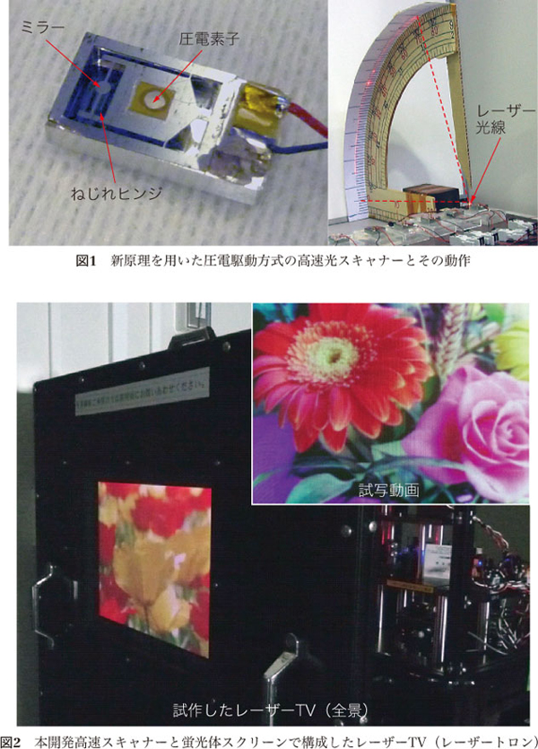 図2は,この光スキャナーと蛍光体スクリーンを用いて実現したレーザーTV(レーザートロン)である。ブルーレイ用の405nmなどの半導体レーザーを,この光スキャナーで2次元走査し,スクリーンに埋め込まれた蛍光体を励起し,従来のCRTテレビのようにカラー動画を形成している。このような方式のレーザーTVは,従来のリアプロジェクション方式と異なり,自発光デバイスであり,視野角が広く,スペックルノイズがなく,輝度むらも小さい。超低消費電力の大型テレビを安価に実現できる可能性もある。