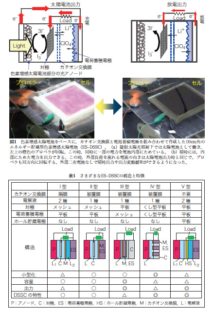 わが国で太陽電池パネルの大量導入を円滑に進めるためには,太陽光発電で生じる昼間の余剰電力を系統に流す場合に生じる過大な逆潮流やその変動の抑制,また,夜間の電力を系統に頼らずにすむように蓄電などを行う必要が生じる。そもそも,太陽電池は電力を「生産」する装置であり,電力を蓄える「電池」ではない。このため太陽電池出力は天候に左右され,光強度に依存して大きく変動し,ローカルな日照条件によっても小刻みに出力変動が加わる。これは,太陽光発電で得た電力を系統に流す上で障害となるが,その抑制のためだけに,高価な太陽電池にさらに高価な二次電池を組み合わせるのはあまり良い方法とはいえない。この「蓄電」という観点では,有機系太陽電池の一つである色素増感太陽電池が持つ「光エネルギーをいったん化学エネルギーに変換した後に電気エネルギーに変換する」という独特な機構を利用すれば太陽電池そのものに二次電池機能を付与することが可能になる。われわれは,太陽電池そのものに電気を蓄えられる「エネルギー貯蔵型色素増感太陽電池」(Energy Storable Dye Sensitized Solar Cell,ES-DSSC)を開発した。
