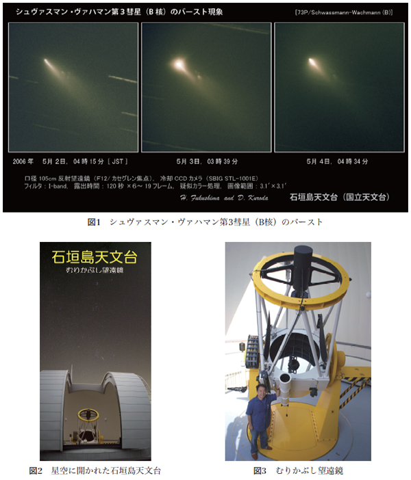 石垣島天文台の完成を待っていたかのように出現したのが,シュヴァスマン・ヴァハマン第3彗星であった。この彗星は,周期5.4年であるが,1930年に発見された後,行方不明になり,1978年に約30年ぶりに再発見された。また1995年には,彗星頭部の核が大分裂を起こし注目された。今回も40個以上に分裂して地球に接近するといわれていた。