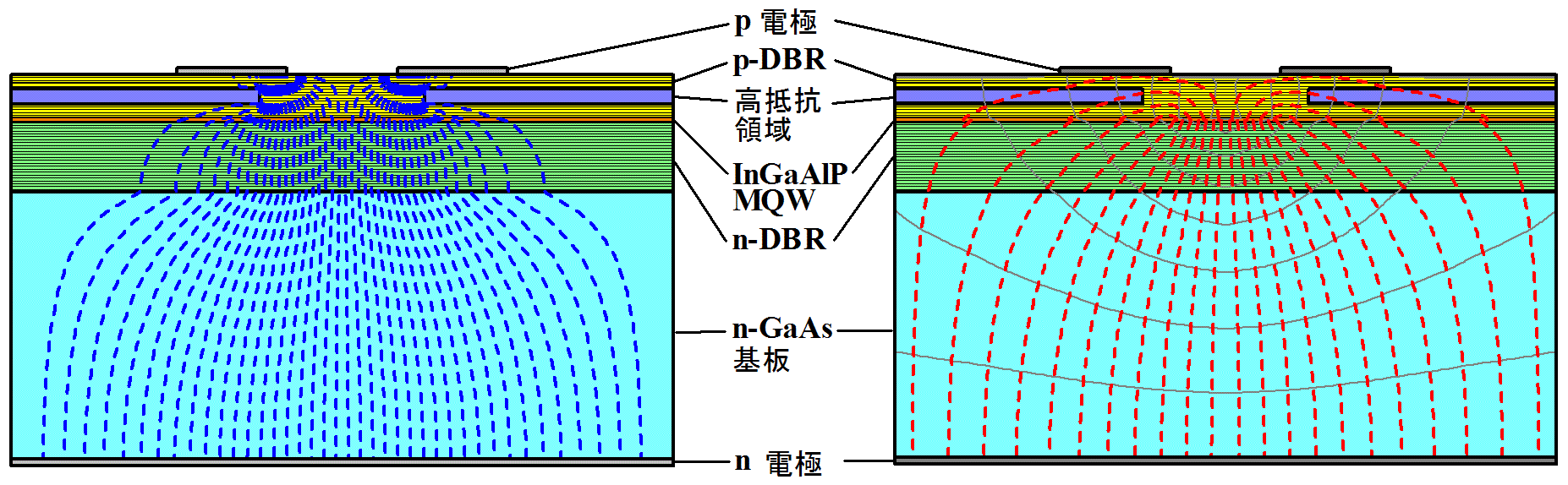 赤色VCSELにおける電流分布と熱流分布のシミュレーション結果