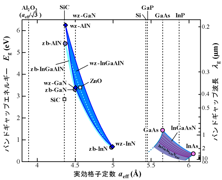 窒素を含む化合物半導体の格子定数とバンドギャップエネルギー