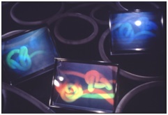 図1は,第1回目のA.I.R.で制作したホログラム(30 cm×40 cm,ガラス乾板)のインスタレーションである。私は2色のレインボーホログラムを試みた。被写体のプラスチックのチューブはソーホーの南端,チャイナタウンと隣接するキャナルストリートを歩き回って見つけた。キャナルストリートは工具類からジャンクな物までありとあらゆる材料を売る店が軒を連ね,歩くだけでもワクワクする。