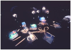 現像液は市販品でなく,最新情報に基づき薬品一品一品をオリジナルの調合で上皿天秤で測りながら作った。ホログラム1枚ごとに使い捨てのため,作業も大変だ。イメージは2種,インスタレーション用に複数のホログラムが必要であった。撮影条件が整えば,後は暗室の中での単調な流れ作業だ。しかし,撮影に油断は禁物。毎回細心の注意を払っていても,時々手痛いしっぺ返しが待っている。まったく同じ条件のつもりでも突然暗い像が現れるのが,ホログラフィーの常だ。地下のラボへいったん撮影で入ると,昼夜のわからない時間が始まる。唯一の友は,暗室に置かれたラジオで音楽を聴くことだった。このようにして,宿泊先とMOHのラボとの往復生活が約4週間続いた。