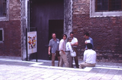図3 パラッツオ・フォルトニ,展覧会ポスターのある入り口とスタッフたち(1982年7月)