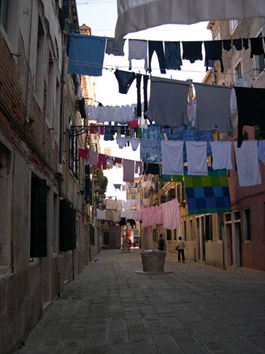 残りの数日は急いで観光に専念する。運河には多くの美しい橋が架かり,どこへでも歩いて行ける距離である。観光ルートを外れ少し路地を入ると生活空間の裏道にでる。ここでは生粋のベネチアンが普通に暮らしている。路地には外猫がたくさんいてのんびりくつろいでいる。ベネチアは実に猫の多い街である。道を挟んで,両側の建物からは洗濯の物干しロープがかけられ,道歩く人の頭上に洗濯物がこいのぼりのように舞っている風景に出会う(図6)。