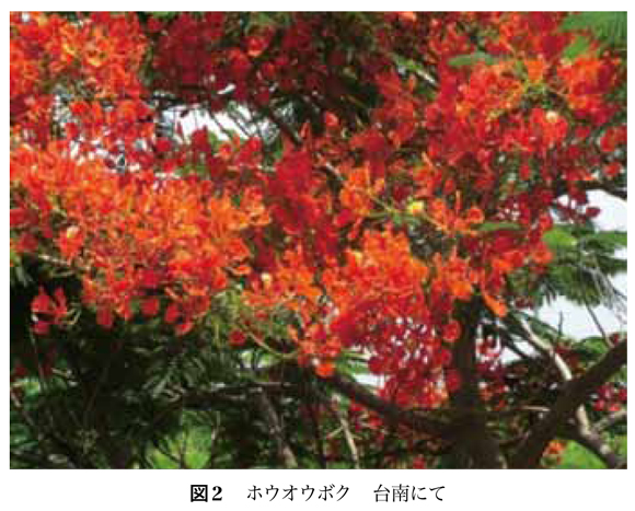 今年の夏(2018年6月),国際会議でリスボンを訪れ,偶然ジャカランダ(図1)の満開の季節に遭遇した。ホテルに面する通りの街路樹が青紫一色に染まっている光景を目にした時,感動と懐かしさがこみあげてきた。私は,初めてジャカランダを目にしたブラジルを思い出した。サンパウロの街なかに多く見かけたその木の風情は,木の姿,枝のはりかた,満開の花の様子,花が散ると木の根元一面が花色に染まった絨毯で覆われる様子など,まるで紫の桜の木としか表現しえない光景であった。その驚きは「南米に紫の桜がある!」と心の中で叫んでしまうほどだった。葉も花の形も木の種類もまったく別ものであるにもかかわらず,その満開の様子は桜を彷彿とさせるものだったのである。日本でも,鉢植えなどで最近は知られるようになったが,大木を見る機会はまだない。ジャカランダは世界三大花木(桜は残念ながら入っていない)と言われているそうだが,その中に,鳳凰(ホウオウ)木(ボク)というのがある。これは真っ赤な花を枝一杯に咲かせる高木である。実は,昨年(2017年)このホウオウボクにも台湾の国立交通大学の台南キャンパスの中で出会った。真夏の台南のうだるような暑さの中,目の覚めるような鮮やかな満開の赤オレンジの花にシャッターを切った1枚が図2である。