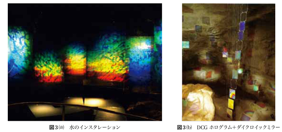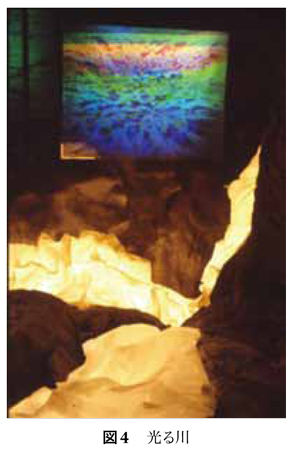 アートセンターの空間はラビリンスのように複雑だ。ホログラムは天井から直接下げるのだが,花崗岩の硬さはコンクリ-トの比ではなく,フォークリフトに乗って天井にアンカーを打ち込む作業は,まるで土木工事さながらの様子だ。もちろん私は下から指示を出すだけであったが・・・。ホログラムのインスタレーション(図3(a)(b))のほか,光のオブジェを制作した。薄いアラミドペーパーで造られた直径1 mの長い円筒の中に,明るさがゆっくり変化する多数の電球を入れ発光させて,岩盤のトンネルの中を縫うように置いた。流れる光の川をイメージしたインスタレーションである(図4)。3Dの音とマルチスピーカーによる,移動する音の演出も行った。実世界から採取した音源を加工し,水や風が地下空間を通り抜け自然を連想させる音作りを試みた。