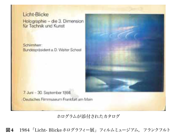 1984年,フランクフルト,マイン川のほとりに建つフィルムミュージアムで開催された「Licht-Blickeホログラフィー展」は,斬新で実験的な展覧会であった。ホログラムのついたA4 ,厚さ2.5 cmの豪華なカタログ(図4)が作られた。さすがドイツは活版印刷発明の国,本を大事にする文化国であると感心した。設営には,従来のミュージアムの設備では対処できない,いろいろな問題をクリアするため,徹夜もいとわずがんばる若い企画者の様子を見て,このメディアの理解度はどこの国でもまだこれからなんだなぁとしみじみ・・・。彼らの苦労がわかるので複雑な気持ちであった。小石は造園業者から取り寄せられ,少しグレーがかってはいたがまずまずで安心した。設営を終え,初日オープニングに出席して,すぐ帰国した。約4か月の会期最終日翌日,フランクフルトから電話がかかってきた。何事かと思いきや,ホログラムが1枚盗まれてしまったという。床に置いただけの作品だから, セキュリティーにはかなり気をつけ,閉館後,毎日ホログラムの数を確かめて注意していたという。会期中ずっと無事で喜んでいたが,最終日を終えて数えたら1枚足りない。盗まれてしまったという。それにしても,最終日に盗むとは確信犯に違いない。私のホログラムが盗難にあった話はいろいろあるが,それは別の機会にするとして,この作品はホログラムが1枚欠けたまま,その後,ドイツの複数の都市を巡回展示されて,1年後に日本に戻ってきた。