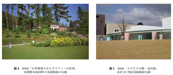 長野県安曇野市の池田町立美術館で個展「石井勢津子ホログラフィーの世界」(2000)が開催された時,美術館の前の公園にインスタレーションを設置した(図4)。公園から南向きの長い階段を上がっていくと美術館にたどり着く。オブジェは下の広い公園から階段わきの植え込みへと続き,観客を会場の美術館にいざなうように設置した。展覧会は夏季の2か月間であったが,野外作品は展覧会終了後も,1年ほど設置されていた。野外作品は風雨や気候の変化に耐えられることは必要条件であるが,ベストの状態を常に保ち続けるメンテナンスはなかなか容易なことではない。特に汚れは大敵であった。