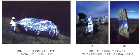 図5は「メビウスの卵・金沢展」(2006)が開催された,金沢21世紀美術館の前の公園のインスタレーションである。作品の周囲は緩やかな起伏がある環境なので,公園内を散歩する人たちには,オブジェの色がいつの間にか変化して見えているに違いない。ここでは展覧会終了とともに野外作品も即撤去された。