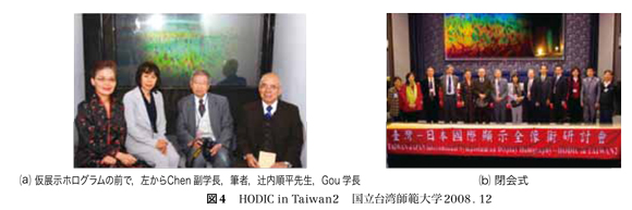 HODIC開催の半年前には,常設のための準備作業のやり取りがスタートした。しかし,設置場所選びにまず難航した。ホログラムが絵画や彫刻と大いに異なるのは,光の環境条件である。学長や副学長らが,学内の重要な建物や空間をいろいろと推挙してくれるのだが,ホログラムの展示にはどこも到底無理な場所ばかりで,私は頭を抱えた。結局,HODIC開催時に,借り展示の実物のホログラムを見てもらうとともに,私が学内の候補場所を片端から見て回り,場所の決定をすることとなった。図4 (a)はHodic in Taiwan 2での仮展示の大型ホログラム(From the Grassland #1 , 75 cm× 145 cm)の前での記念撮影である。図4(b)は閉会式の記念写真であるが,できあがってきた画像は,背景の大型スクリーンに,なぜか私のホログラム画像が合成されていた。