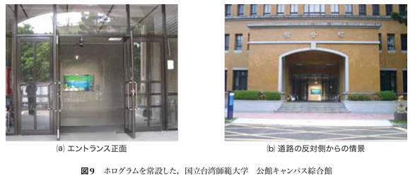 ホログラムフィルムは2枚のガラスで挟む(図7 (a))。背面用のミラーは表面鏡がのぞましいので,鏡面加工されたステンレス(図7(b))を使用し,ホログラムとミラーはステンレスのフレームで一体化し壁に取り付けた(図8)。かなりの重さになるので,取り付ける壁は頑丈であることが条件だ。設置場所は公館キャンパスの総合館のエントランスの正面の壁(図9(a))と決まった。美しい石の壁面にアンカーを打ち込む許可を得て,ホログラムを設置した。天井には光源を取り付けるための細工と電気工事を行った。このビルはキャンパスの正門を入るとすぐ左手にある建物で,カンファレンスやセミナーのための施設である。昼間,道路を挟んで反対側から建物を眺めたシーンが図9(b)である。人々は門を入り左手の建物を眺めると,このようなシーンが見えてくる。建物の玄関は道路面から高度差があり,人が玄関に入るには階段を上るのだが,その時自然に目の高さが変化する。それにつれてホログラムの色彩も変わるという仕掛けである。もっともこの効果に気付く人がどのくらいいるかは不明だが。