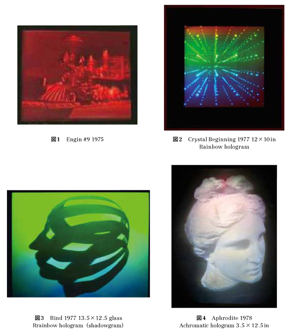 ホログラフィーを初めて学ぶ者は,まず重要な5人の名前を知ることになる。デニス・ガボール(ハンガリー,ホログラフィーの発明),エミット・リースとユリ・ウパトニクス(アメリカ,レーザー光による鮮明なホログラムの記録と再生に成功),ユリ・デニシューク(旧ソ連時代,ワンステップの反射型ホログラムの発明),そしてスティーブ・ベントン(アメリカ,レインボウホログラム・白色再生透過型ホログラムの発明)。特にベントンのことはよく耳にしていたので,新参者の私にも早々に直接本人に会える機会が巡ってきたと大感激であった。アートへの応用を志していた私にとって,ベントン型ホログラムは特別なものだった。彼が開発し制作したホログラムの技術とイメージはどれもアートマインドに溢れた素晴らしいものだった。彼の初期の作品(図1,図2,図3,図4)はどれも世に広く知られている。Crystal beginning(図2)を初めて見たときもそうであったが,Rind(図3)を見たとき,まるでエッシャーの世界の実空間への具現化のようで,ホログラフィーならではの面白さが十分に伝わるイメージにただ驚き感心させられた。機関車(4×5in)(図1)は後に多く再制作されギフトとして用いられていたようで,私の大事なコレクションの1つにもなっている。Aphrodite(図4)はアクロマチックホログラムで,透過型ホログラムであるがレインボウには色変化せず,イメージは白色に再生される。オリジナルの被写体に大理石像を選んだのもなかなかにくいアイディアだと感心させられた。