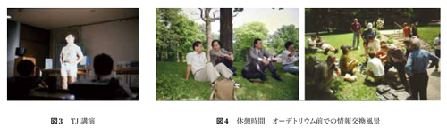 講演会初日,TJが初登壇するとそのファッションにびっくりした。なんと短パンという,あまりにカジュアルなスタイルで現れたのだ(図3)。夏のリゾート地のミーティングといった風情に,日本人の私は少々面食らった。以来,多くの参加者はみなTシャツ短パンといったリゾートファッションで,私もすぐにアメリカ文化をエンジョイすることになった。講演会場のオーデトリウムの建物周辺も緑多い環境である。休憩時間や講演を抜け出しては,参加者たちは思い思いに木陰や芝生でくつろぐ。このような環境はなかなか心地良く,参加者同士の貴重な情報交換の機会でもあった(図4)。