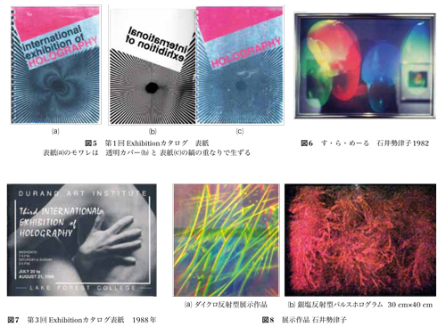図7は第3回のカタログ表紙である。この時の出品作品はダイクロ反射型(図8(a))と銀塩反射型ホログラム(図8(b))である。ダイクロ作品はリップマンホログラムを2枚貼り合わせてダブルイメージとし,ホログラム(ガラス)面の前後に結像する。銀塩のホログラムはイメージタイプで,やはりイメージはホログラム(ガラス)面の前後に結像する。まず,マスターとなるホログラムをパルスレーザーで羽毛を撮影した。そして,マスターホログラムの像をオブジェとして反射型に仕上げたホログラムである。1987年に10か月間パリに滞在していた時,スウェーデンのストックホルムのパルスのホログラムスタジオで制作したものである。出品には毎回,できるだけその時々の最新の作品を展示するように心がけている。