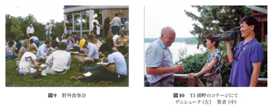 学内のレストランは私が経験する日本の学食とは大違いである。バイキング形式でボリュームは取り放題,新鮮なフルーツがふんだんに用意されているのも感激であった。その食事も,時にはピクニック気分で芝生の上で自由気ままという演出(図9)は,ファミリーづれの参加者にも心優しいイベントである。湖畔では毎回恒例の参加者全員によるバーべキューパーティが催された。バーベキューの準備が整うまでの間,参加者たちは皆,思い思いに湖畔で過ごす。泳ぐものあり,ヨットを操るものありで自然を満喫しながら過ごした。バーベキューパーティーはTJのファミリーを巻き込んでのアットホームなものだ。TJは湖畔のそばにコテージを持っていて,そこを訪れるのもお決まりのコースだ。図10はTJの別荘でのデニシューク,筆者,韓国のアーティストJuyong Leeとのスナップである。