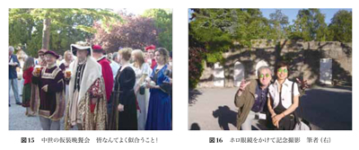 ノースウエールズでのシンポジウムのハイライトの1つは,仮装晩餐会であった。参加者は中世の衣装を身にまとい,古城内の食堂を模したレストランで,中世の時代にタイムスリップしながら晩餐をいただく,という趣向である。仮装のための衣裳部屋をのぞくと,あらゆる身分の様々な衣装がそろっていた。正確にはよくわからないが,王とか女官,僧侶,騎士,道化師などなど。自分の着たい衣装を各自自由に選ぶのだが,皆,実によく似合っていた。自分に似合うものをよく選びだすものだと感心した(図15)。晩餐が始まる前の,庭先で待つひと時のあいだ,お互いの衣装を眺めて,思わず吹き出したり,愉快な会話が弾んだ。王の衣装は,TJとともに今回のシンポジウム企画の立て役者のHans Bjelkhagenである。左にはTJの姿がある。何の衣装かわからぬが,やたらよく似合っているのも傑作だ。筆者は,仮装は遠慮した。理由は,イギリス人たちは皆,背が高い。小柄な筆者には絶対に合うサイズが見つからないと思ったからだ。ロングドレスを着ようものなら袖は腕をすっぽりと覆い,スカートの裾を踏んで転ぶのがオチであろう。どう考えてもムリとあきらめて周りを見渡したら,衣装を着ていない仲間も結構いた。図16は,ホログラム眼鏡をかけた筆者たちである。眼鏡には目が撮影されている。緑色に輝くこの眼鏡をかけたら,“にらめっこ”には絶対に勝てること間違いなし(笑)。