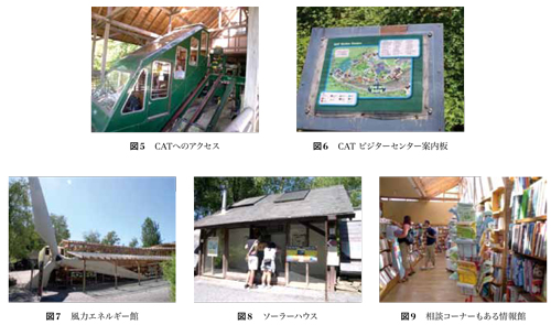 翌日,バス時刻表を確認して出かけた。公道からビジターセンターへのアクセスは,専用のケーブルカーに乗る(図5)。広い敷地内に様々な施設が点在していた(図6)。風力エネルギー館では,風力発電の羽の大きさを実感できる工夫がされていた(図7)。ソーラーエネルギーのモデルハウス(図8)などが建ち,雨水を利用した循環式の水洗トイレや水を使わないバイオのトイレなどの実践も知ることができる。子どもづれのファミリーの見学者も多くみられ,エコライフを体験できる代替技術の啓蒙センターであった。情報館では書籍だけでなく,エコな家への改修の手伝いや新しい建築への具体的な相談コーナーも設けられていた(図9)。現在,地球温暖化とゼロカーボンの問題は世界的に大きな話題であるが,1970年代にこのセンターがスタートしたころはまだ一般的な認知はかなり低く,筆者が訪れた16年前でも,国内では積極的な興味はもたれていなかったように記憶している。広大な敷地のエコセンターに,多くの一般の見学者が訪れている様子は驚きであった。
