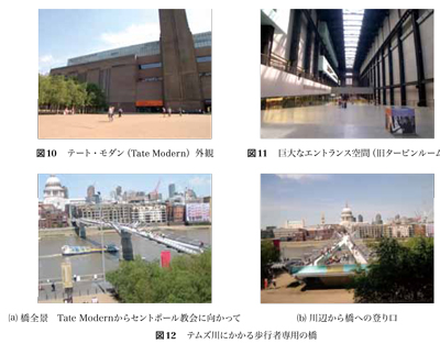川を挟んだ向かい側には,ロイヤルウエディングの式が行われた,有名なセントポール寺院がある。美術館のオープンに合わせ,対岸と結ぶ歩行者専用の橋が新たに建設された(図12(a),(b))。その斬新なデザインと,水面の上の風に吹かれながらゆったりと散歩できる環境は実に魅力的であった。河畔も散歩コースとなり新たな観光名所となっていた。
