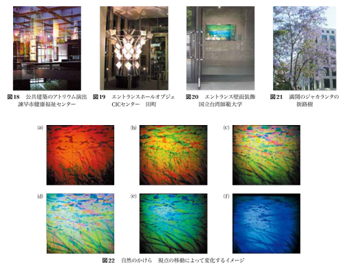 筆者の発表は2016年ホロセンター・アートグラントで制作したホログラムについて述べた。このアートグラントを授与された6人の作家たちによるパリとニューヨークでの作品展については前回(本誌2022年9・10月号掲載)述べたとおりである。「自然のかけら」(図22)のイメージは,これまで数多く自然をモチーフとして制作してきた一連の作品の延長線にある。初めは自然の“もの”,貝(図23)や玉子(図3)に始まり,自然の一部を切り取る植物シリーズ(図16,図17,図24 ,図25 ,図26) へと興味が移っていった。そんな折,ゴッホの没後100年を記念した1990年,オマージュゴッホ展が企画された。現代アート作家たち5人によるオマージュゴッホの新作展で,筆者にも出品依頼が来た。それまで考えたこともなかった課題に,どうしたものか? そこでひらめいたのが,印象派の画家たちの目線に立って,現代のホログラフィー技術を用いたらこのような表現もあり得るのではと考え,点描のようなブラッシュワークの絵画的手法を用いて,光の塊が3次元空間に散らばる風景の空気感の表現を試みた(図27)。これを機にブラッシュワークの表現の面白さに目覚め,それからはブラッシュワークと植物の混合モチーフで構成して風景を連想させるイメージの作品へとつながっていった(図22 ,図28)。自然のかけら(図22(a)~(f))は視点の移動によって変化するイメージバリエーションである。観る人は1枚のホログラムから,夕焼け,薄暮,春や冬景色など様々なシーンを連想いただけたら嬉しい限りである。