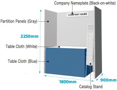 This type of booth includes a table[1800(W)×900(D)×740(H)mm], tablecloths (White & Blue), back & side panels, company nameplate with general font (1plate per booth), which will be provided by the secretariat. The table is removable if unnecessary.