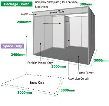This type of booth includes partition panels, stockroom, accordion curtain, parapet, punch carpet, company nameplate with general font (1 plate per booth), which provived by the secretariat.