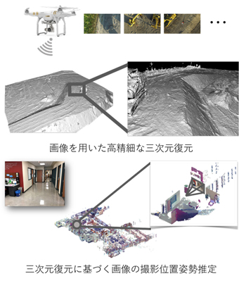 本研究は,画像の入力に対して被写体形状等の撮影環境の高精細な復元を行うことを目的とする。研究室が開発したOnlineSfMシステムは,ドローン等を用いて連続的に撮影される画像に対して手元のPC上で撮影位置姿勢と被写体3次元形状の逐次的な復元を行い,撮影者にインスタントな復元結果を提供するもので,災害現場等での操縦補助や効率の良い撮影環境の把握が実現できる。また,逐次的な復元結果を基にしたオフラインでの解析により,撮影時の光源の分布と被写体の反射率を分離し,より高精細な3次元モデルを生成できる。このような高精細3次元モデルは,ゲーム・VR等のエンターテインメントへの利用だけでなく,画像入力に対して自己位置情報を提供する3次元データベースとしての応用も期待され,広く注目されている。さらに,復元されたモデル・撮影位置姿勢に基づき,撮影環境の異なる入力画像に対して頑健な位置姿勢推定を行うシステムの開発も手掛けており,自動運転車・ロボット等への自己位置情報の提供や,ナビゲーションシステムへの応用が期待される。