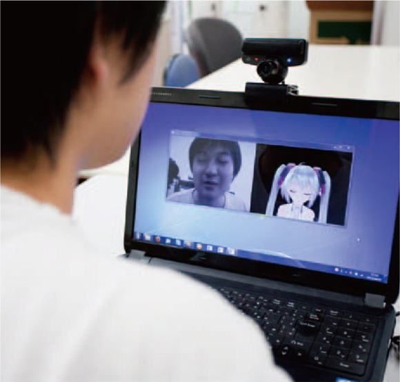 研究室では,コンピューターが画像や動画から顔検出や年齢推定,顔の向き推定,表情認識を実現する顔画像処理に関する研究も行っている。AR技術の基盤となる実空間と仮想空間の位置合わせに取り組み,実際の人の動きとアニメーションを連動させるための高速・高精度な顔の向きの推定手法の開発や眉や口角の変化情報を用いての表情認識の研究,またヘッドマウントディスプレイを用いた仮想情報を現実世界へ重畳させる研究などを進めている。顔の動きや表情を0.1秒以内で追跡し瞬時に反応させるため,追跡点を目の両端や口の両端など数点程度に絞って計算速度を速めたことにより実現した。パソコンの上部に取り付けた小型のカメラ(Webカメラ)で人の顔の動きを認識し,それに画面上のアバターがその人の顔の動きにリアルタイムに連動する(図3)。まばたきや口の動きもリアルタイムに同じ動きをするアバターシステムは,アニメやイベント,CM制作会社など,さまざまな企業からの引き合いが来ているそうだ。動画による会議などにアバターに参加させたり,アバターになりきることが可能となる。