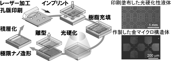 研究室で独自に提案して検証を進めるレーザー加工孔版印刷+光ナノインプリント成形「Print and Imprint」法(特許登録)による極限ナノ造形に取り組んでいる。高分子薄膜へのレーザー穴あけ加工と孔版印刷により高粘度光硬化性液体の位置選択的塗布が可能となった。Print and Imprint法による桁違いにサイズの異なるナノサイズからマイクロメートルサイズが共存した2次元構造体の大面積作製や,3次元積層化を目指している。