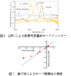 光通信システムの大容量化は,時分割多重, 波長分割多重の多重化により進展し,さらに,信号光の位相と振幅の利用した多値変調も実用化され,残された多重化軸は空間方向の自由度(空間モード)である。モード多重通信(MDM)では,モードの分離はディジタル信号処理(DSP)が主流であるが,DSPを用いないで空間モードを自由に操る技術,ピュアな高次モードの生成技術等も必要となる。そのために,モード変換器,モードフィルター,光導波路を使ったモード合分波器などを研究している。図6は2モードファイバーを用いた長周期ファイバーグレーティング(LPFG)による基本モードフィルターの特性を示す。高次モードのパワー比率を向上できた。一方,空間モードの計測技術としては、モード励振比およびモード結合係数の測定法などを提案した。 図7は曲げ損失のモード依存性を利用したインライン型の励振比評価法で測定した励振比設定値(横軸)と励振比測定値(縦軸)の関係を示す。また,モード変換技術とFMFを利用したファイバー干渉計による歪みセンサーなど,FMFをセンサーに応用する研究に着手している。