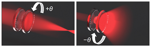 研究室では,ガラス基板上にアモルファスシリコンのナノ柱構造をメタアトムとして1,700万本配置した「モアレ・メタレンズ」を作成した。これは2枚のレンズからなり,お互いに回転させることで凸レンズにも凹レンズにもなる。これは,焦点距離が正(凸レンズ)から負(凹レンズ)に連続的に変化することに対応する。また,回転させるだけで焦点距離が変わるため,通常のズームレンズのようにレンズ間に間隔を必要とせず,小型化に適している構造であることが特徴である。電子線描画技術等を用いてこのレンズを実際に制作し,波長900 nmの近赤外線で焦点距離を変化させられることを実証した。今後は可視光などより短波長での動作や,カラー化(色収差の抑制:違う色を入れても焦点距離が変わらない)を進めていく。また現在は手動で回転角を変えているが,マイクロ自動ステージと集積化することなどによる自動化を目指す。