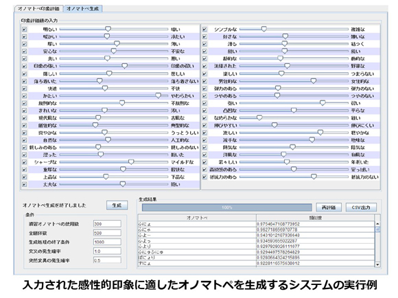 近年,オノマトペを構成する音韻の印象を定量化できることを用いた工学的研究が,人工知能分野で盛んであるが,類似するオノマトペ表現が個々にもつ微細な印象の差異を把握することは難しいとされていた。研究室では,被験者実験で,日本語の音韻を網羅したオノマトペを実験刺激として音韻と印象の結びつきを取得しているため,それらの音韻を組み合わせて生み出される可能性のある,あらゆるオノマトペの意味も推定できるようにした。しかし,それはユーザーが求める直感的で微細な印象に合致するものではないので,ユーザーの入力した印象評価値に適合した音韻と形態をもち,なおかつオノマトペとしての一般的な構造を保った表現を生成するシステムを提案し,オノマトペ印象評価システムと組み合わせることで,表現したい印象に適合し,かつ新奇性のあるオノマトペ表現の創作支援を行える可能性を示した。