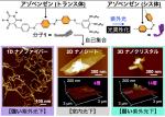 千葉大学などのグループは、光に反応して形や色が変化する分子「フォトクロミック分子」が自己集合して作られるシート状の構造「二次元ナノシート」に強度を変えて光を照射すると、細いひも状の一次元ナノファイバーや、積み重なった厚い塊である三次元ナノクリスタルなど、全く異なる構造に変化することを発見した。さらに、この構造変化の様子を、高速原子間力顕微鏡(高速AFM)を用いてリアルタイムで観察することで、詳細なメカニズムの解明に成功した。本研究成果は、生体分子のように外部環境の変化に柔軟に適応して形態を変えることのできる、次世代機能性材料の開発に繋がることが期待される。