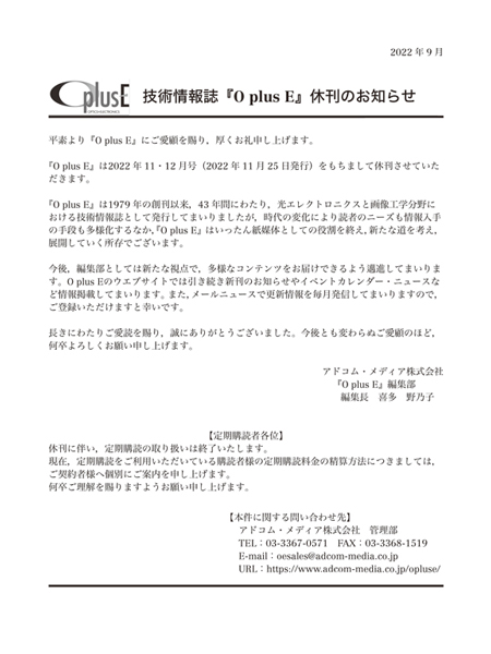 『O plus E』は1979年の創刊以来,43年間にわたり,光エレクトロニクスと画像工学分野における技術情報誌として発行してまいりましたが,時代の変化により読者のニーズも情報入手の手段も多様化するなか,『O plus E』はいったん紙媒体としての役割を終え,新たな道を考え,展開していく所存でございます。