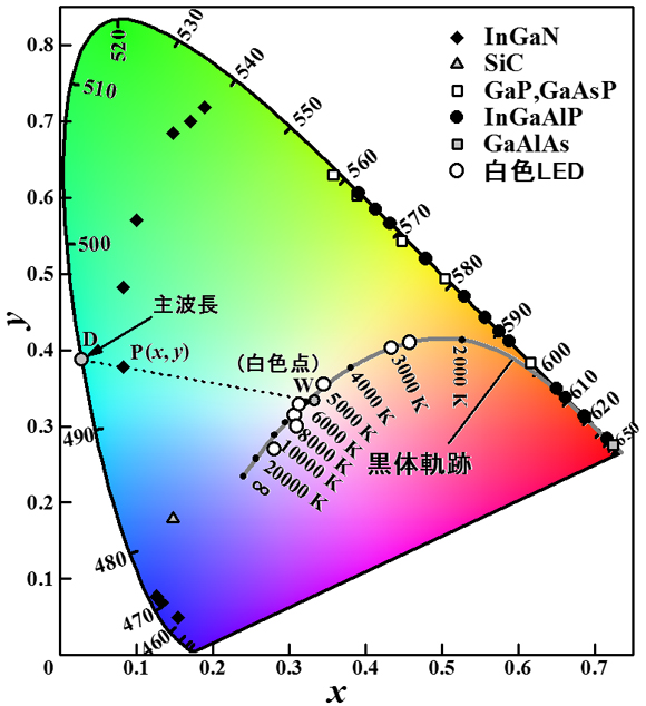 図2 可視LED,白色LEDの色度