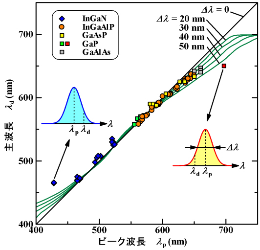 図3 市販LEDの主波長とピーク波長との関係