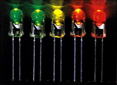 図7 製品化されたInGaAlP系LED。波長は右から644 nm(赤), 612 nm(橙), 590 nm(黄), 574 nm(黄緑), 562 nm(緑)