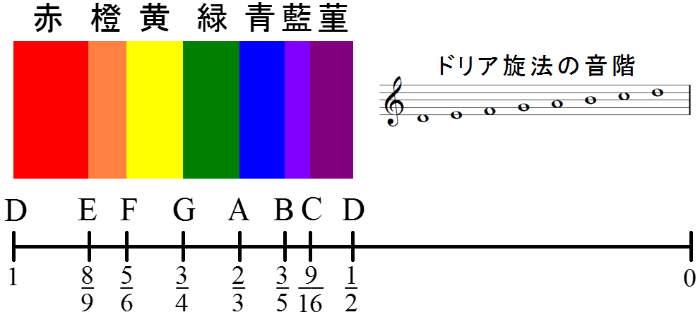 図D ニュートンの色の音階とドリア旋法。下の線は弦を押さえる位置を示している。最下段の数値は,ニュートンの図に記載されているもので,左のD(レ)の音を1とした場合の弦の長さに対応している。
