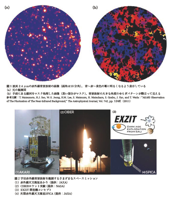 表紙の図1は,JAXAが2006 年に打ち上げた赤外線天文衛星「あかり」によって得られた,りゅう座の方向における,波長2.4mmの赤外線の背景放射画像である。図1(a)は元の観測画像であり,画角は天空の10 分角の大きさに相当する。点状の像は,ほとんどが遠方にある銀河で,この時点では宇宙最初の星は視認できない。図1(b)は,それらの奥深くに潜む背景放射を調べるため,手前にある銀河をマスク処理(黒い部分)した画像である。約1分角に相当する明暗のむら(ゆらぎ)が,はっきりと浮かび上がった。ゆらぎの振幅は大きく,その放射スペクトルも含めて,われわれが知るどの天体によっても説明がついていない。