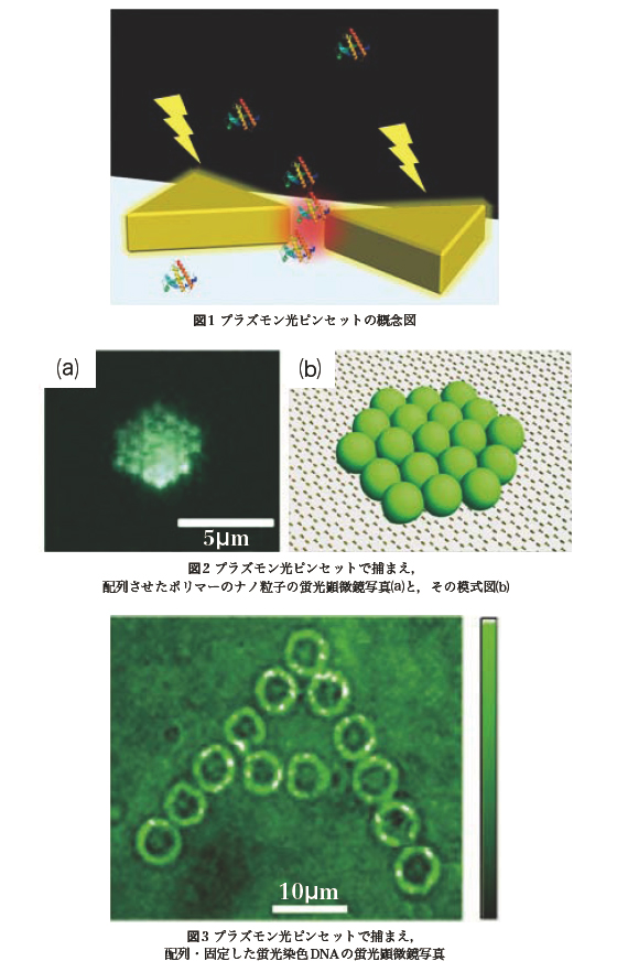このようなプラズモン光ピンセットは,細胞への遺伝子導入や医療診断に役立つDNAチップ,プロテインチップの開発につながるかもしれない。また,ナノ空間における単分子の自在操作やそれに基づく選択的合成や分離など,革新的な技術開発につながることが期待される。