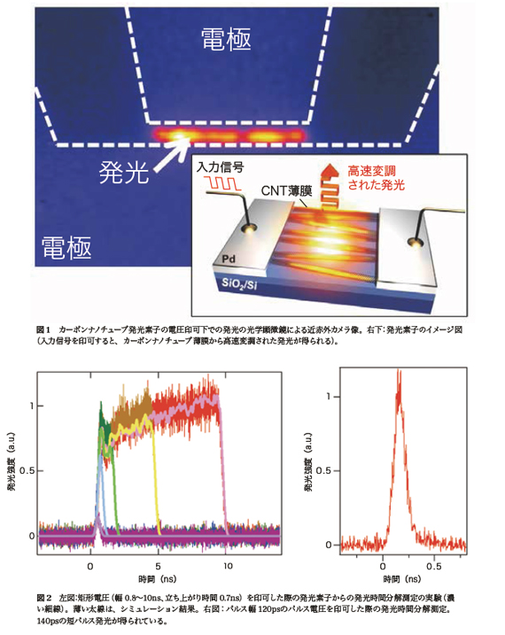 最近,われわれは,カーボンナノチューブ薄膜を用いた発光素子によって,高速変調が可能な超小型発光素子をシリコンチップ上で作製することに初めて成功した(図1)。本素子は,アルコールを原料として成長したカーボンナノチューブ薄膜に電極を形成するという簡単なプロセスで作製され,通電によるジュール加熱に伴って黒体放射による発光が得られる。黒体放射は,非常にブロードな連続発光スペクトルを有しており,同様の光源としては白熱電球が知られているが,今回,カーボンナノチューブの薄膜を用いて熱を速やかに基板に逃がす素子構造を実現し,従来の金属フィラメントによる電球と比べて100 万倍以上高速となる1Gbpsでの高速変調や半値幅140psのパルス光発生の発生に初めて成功した(図2)。また,発光機構の理論的な解明も進め,理論的には10Gbps以上の高速変調が可能であることを示した1)。