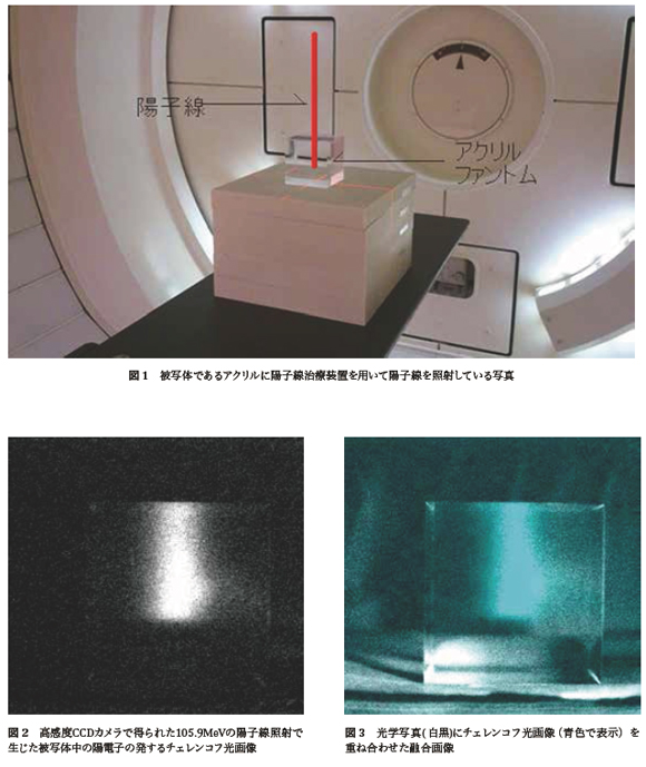 今回,我々は名古屋陽子線治療センターと共同で,陽電子が物質中を運動するときに,チェレンコフ光という微弱な光を放出することに着目し,この光を高感度CCDカメラで撮像することで,陽子線照射により生成した陽電子の分布を,これまで得られたことのない,0.7mmという極めて高い空間分解能で画像化することに成功した。