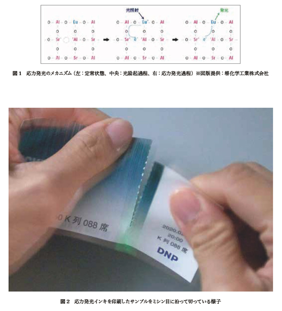 このような応力発光体を偽造防止対策が必要な媒体に塗布して,折り曲げたり擦ったりする際に光らせることができれば,器具を使用せずに発光により真贋を判定することが可能となる。我々はインキの盛量が多くかつ量産性が高いフレキソ印刷での製品開発を行った。暗い場所でミシン目を切り取る(図2),折り曲げる,印刷物の上から硬いペン先でなぞるなどの動作をすると,目視で緑色の発光を確認することができた。なお光量はインキの盛量すなわち印刷物中の応力発光体の含有量によって調整できることも確認した。また,フェードメーターで耐光性を評価したところ,通常光換算で14ヶ月程度光を照射した場合でも発光を確認でき,有価証券類として十分な耐光性を有することを確認した。