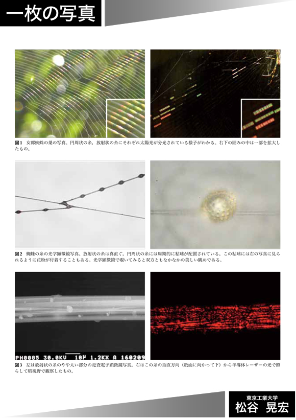 それでは早速観察してみよう。図1は筆者の自宅の庭に張られたジョロウグモの巣である。部分的に虹色も見えている。図2の左の写真は,三浦半島ではないが,勤務先(横浜市)のキャンパスで採集したジョロウグモの糸の光学顕微鏡写真である。真っすぐな方が放射状に張られた糸,「だま」のある方が円周状の糸である。観察した範囲では,これらの糸の太さはおよそ2μm,「だま」の間隔は50~150μmの見事な周期構造であった。「だま」は粘球といい,これにいろいろなものを付着させて捕らえる。図2の右の写真は,花粉が捕獲された個所を共焦点顕微鏡風に深度合成して仕上げたものである。図3の左の写真は放射状の糸のやや太い部分を走査型電子顕微鏡で観察したもので,複数の糸がねじれなく合わさっていることがわかる。この糸の垂直方向から半導体レーザー(波長670nm)で照らして暗視野で観察してみると,右の写真のように回折格子のように見える。ここで図1に戻ると,円周状の糸と放射状の糸では太陽光の分光の様子が異なっていることに気付く。どうやら,周期的な粘球とねじれのない糸の集合では糸に対して回折の方向が異なるため分光の様子に違いが出たようだ。調子に乗って図2の右の写真を眺めてみると,蜘蛛の糸が導波路,花粉が球体の共振器で共振器の表面に周期的突起構造をもつ天然の光デバイスのようにも見えてくる。上手に実験できたらそのうちどこかの学会でこっそり報告してみよう。ずいぶん昔に芥川龍之介の小説を読んでから,家の中で見つけた蜘蛛はフィルムケースで捕らえて外に逃がすようにしている。今回の観察で得られた造形美は,蜘蛛からのすてきなプレゼントだったのかもしれない。