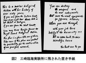 それを聞いた團さんは実験所の破壊を防ぐために,接収にくる米軍宛に置き手紙を残していったのです。その手紙の内容は,「この施設はもともと大学の科学実験施設で,軍事目的のものではないから破壊しないでほしい」という内容で,最後に“The last one to go(最後に立ち去る者)”とだけ署名されていました(図2)。その團さんの熱意が通じたのでしょう,三崎臨海実験所は破壊されることなく,その年の大晦日に大学に返還されたのです。この話は「タイム誌」にも掲載され,その手紙は現在,アメリカ マサチューセッツ州のウッズホールにある海洋生物学研究所(Marine Biological Laboratory:MBL)に展示されています。